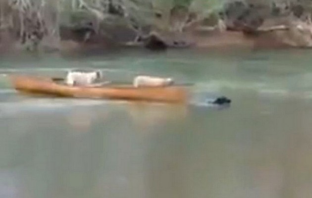 Στο βίντεο βλέπουμε δύο σκυλιά που βρίσκονται σε μέσα σε βάρκα που...